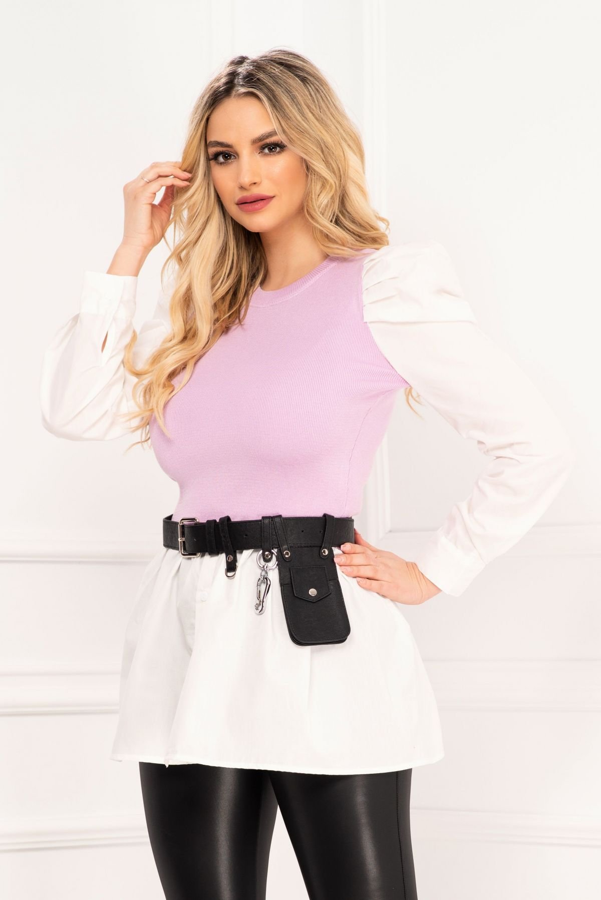 Camasa casual cu vesta lila aplicata din tricot Culoare:alb lilaCroi cambratManeci lungi Decolteu rotund la baza gatuluiTextura:tricot vascozaDoi nasturi in partea de josVesta neagra elasticaCentura chic detasabila in talieCompozitie: 75% vascoza 20% bumbac 5% elastanProdus de import ☑️ Calitate verificata InPuff* Modelul nostru poarta marima 36 (S) !* Echipa InPuff face toate eforturile in a prezenta cat mai bine culorile produselor prezentate pe site insa culorile pot diferi de situatia reala si pot varia în functie de setarile monitorului/dispozitivului dvs!