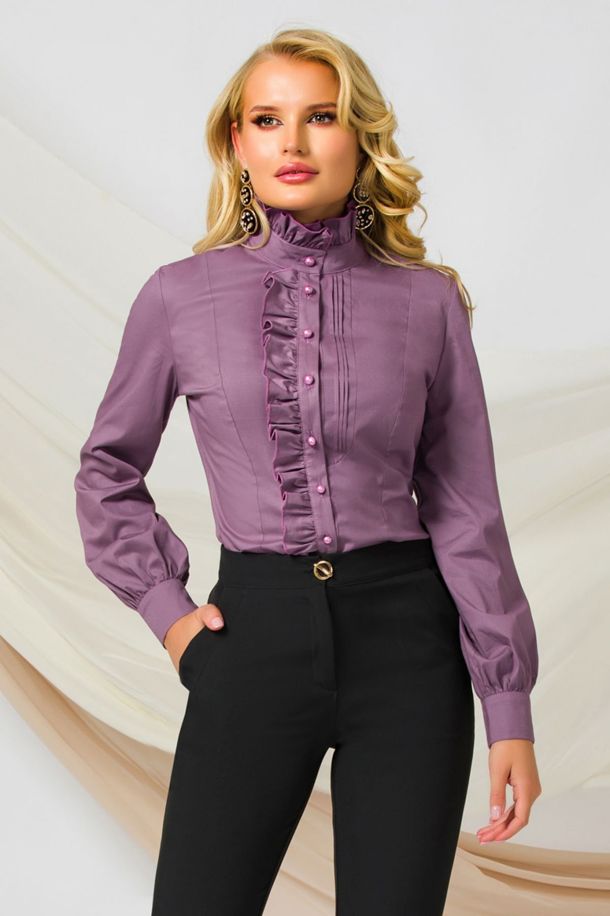 Camasa office eleganta Pretty Girl lila din bumbac cu volanas Camasa cu croiala cambrata din poplin usor elasticVolanas aplicat pe mijlocul feteiGuler tip tunica cu volanas aplicatMâneca lunga si bufanta cu manseta la terminatieManseta cu închidere în doi nasturei perlutaÎnchidere frontala cu nasturei perlutaLungime produs din mijloc umar fata pâna în tiv: 58 cm pentru marimea 36Lungime mâneca: 635 cm pentru marimea 36Latime manseta: 55 cmCuloare: lilaCompozitie: 97% bumbac 3% spandexProdus fabricat în România. * Modelul nostru poarta marimea 36(S)* Echipa InPuff face toate eforturile in a prezenta cat mai bine culorile produselor prezentate pe site insa culorile pot diferi de situatia reala si pot varia în functie de setarile monitorului/dispozitivului dvs!