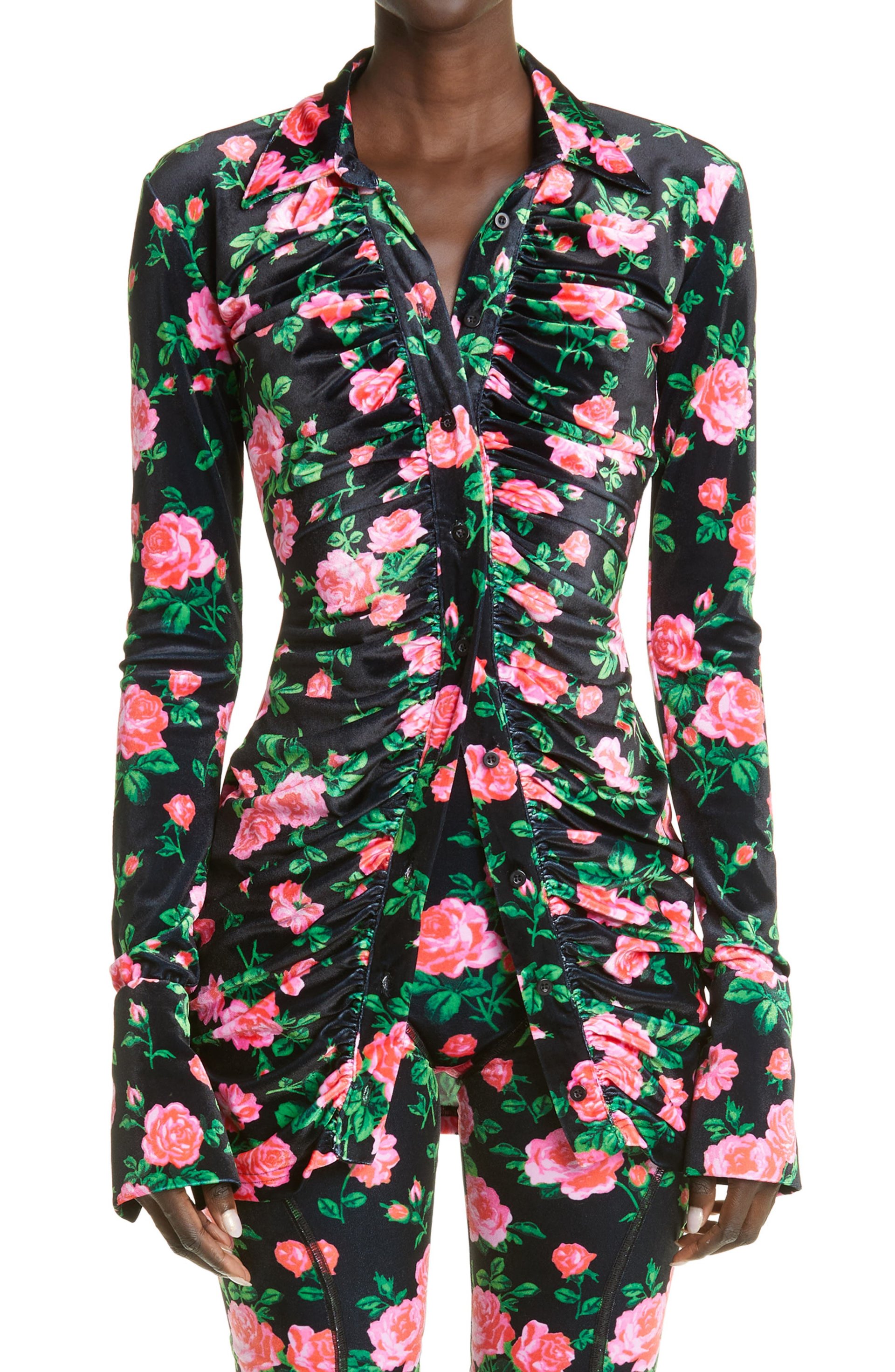 Floral Ruched Long Sleeve Stretch Velour Minidress